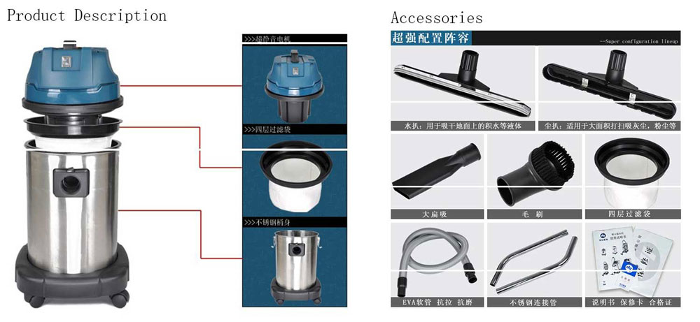 Adopta tecnología bimodal alemana, sistema de circulación automática y puede funcionar durante 600 horas de forma continua. Los accesorios son los mismos que los de las grandes aspiradoras comerciales. 38 grandes diámetros, húmedo y seco, polvo y agua. La salida de aire de escape doble de 360 ° se utiliza para garantizar el sistema de enfriamiento del motor, y el depósito para polvo está hecho de acero inoxidable.